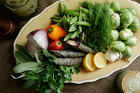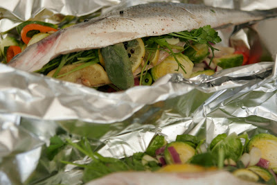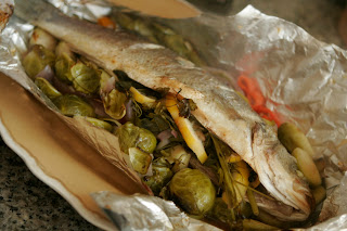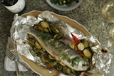 My date is sufficiently impressed so now it’s time to bring in some friends, and have a party, but My wallet’s kind of slim these days and I don’t want to show it. This is when whole fish and farmer’s market vegetables come into play. Fish that has not been filleted is about $2 less per pound, and once cooked falls easily away from it’s bones and skin.