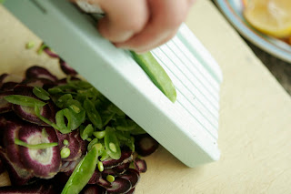For the salad we’re using those gorgeous black carrots from the farmer’s market last week and we’re keeping them raw so they maintain their stunning color. Also we’re going to use the sugar snap peas. If you have a mandolin, watch your fingers and slice up some of your vegetables. If this sharp tool gives you the willys, you can use a knife and slice as thin as possible.