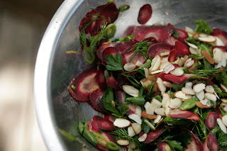 Now add those reserved soft herb leaves, some salt, pepper, olive oil, lemon juice, maybe some toasted nuts (or raw if you want to maintain their maximum nutritional value) and some rice wine vinegar. Toss, toss.