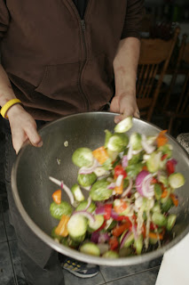 Chop up your vegetables. We used those Brussels Sprouts from last weeks Santa Monica Farmer’s Market, purple onion, peeled and sliced garlic, and peppers; Salt, pepper, olive oil and some cheap white wine. That whole elitist edict of not cooking with wine you wouldn’t drink is hogwash. Two Buck Chuck is perfectly fine here. Save the good stuff for the table.