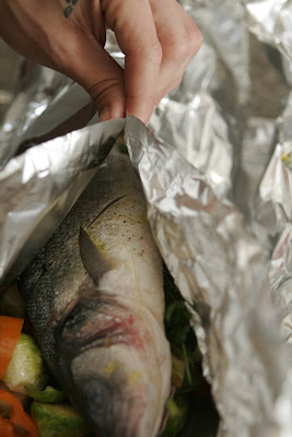 The goal now is to wrap the foil tightly around the fish, pinching the long ends together and folding over, then folding up the two other sides securing the fish to be air tight.
