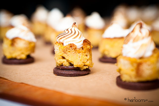 Next, well this is one we were doing for the holidays because I love pumpkin and I love pretty bite-size desserts that compel me to look rather than eat. This one is a Spicy Pumpkin Bread Pudding with Toasted Marshmallow atop a Chocolate Cookie. Patrons at Silverlake Wine did not seem to mind that approaching February I am still hung up on pumpkin. It is a Power Food afterall!!!